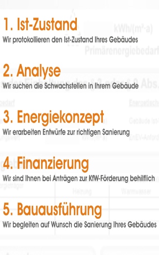 Wir helfen Ihnen Ihr Gebäude zu optimieren. Gerne erstellen wir Ihnen ein komplettes Sanierungskonzept, betreuen die notwendigen Bauarbeiten als Sachverständiger und stellen die Nachweise für die KfW aus.